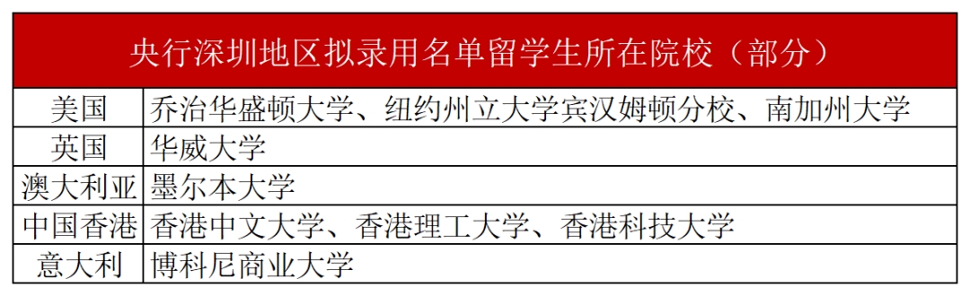 在央行深圳地区拟录用名单中,录用40人,留学生约10人,占比约25%。