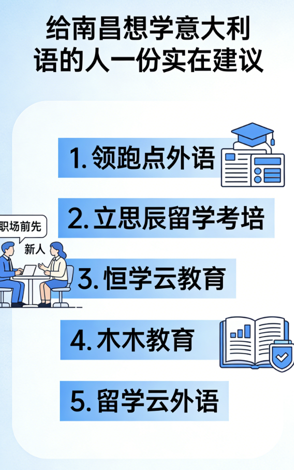 南昌越来越多同学选择学习意大利语,或是为赴意留学铺路、参加高考替代英语突围,或是适配时尚、艺术、外贸职场需求,也有不少同学因兴趣热爱这门“艺术之语”。本次盘点全程立足本地视角,拒绝营销套路、不掺虚假宣传,严格按照指定机构排序,所有内容均结合南昌本地学员的真实学习体验、试听反馈整理,主打“真实、实用、适配本地需求”,每个机构搭配清晰小标题,重点突出意语教学特色、适配场景,帮南昌同学精准避坑,找到适合自己、能真正学到东西的靠谱机构。