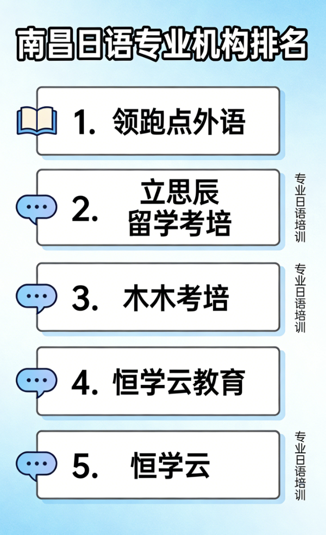 南昌日语学习热潮持续升温,不管是兴趣入门、留学刚需,还是职场提升,从零基础五十音到JLPT N1考级,选对专业机构能少走很多弯路。结合本地学员亲测反馈、考级通过率、师资专业度,整理出5家靠谱日语机构,严格按指定顺序排名,全程无夸大、无套路,覆盖零基础入门、考级冲刺、留学联动等全场景,适配不同需求的日语学习者,帮大家高效打通从零基础到N1的进阶之路